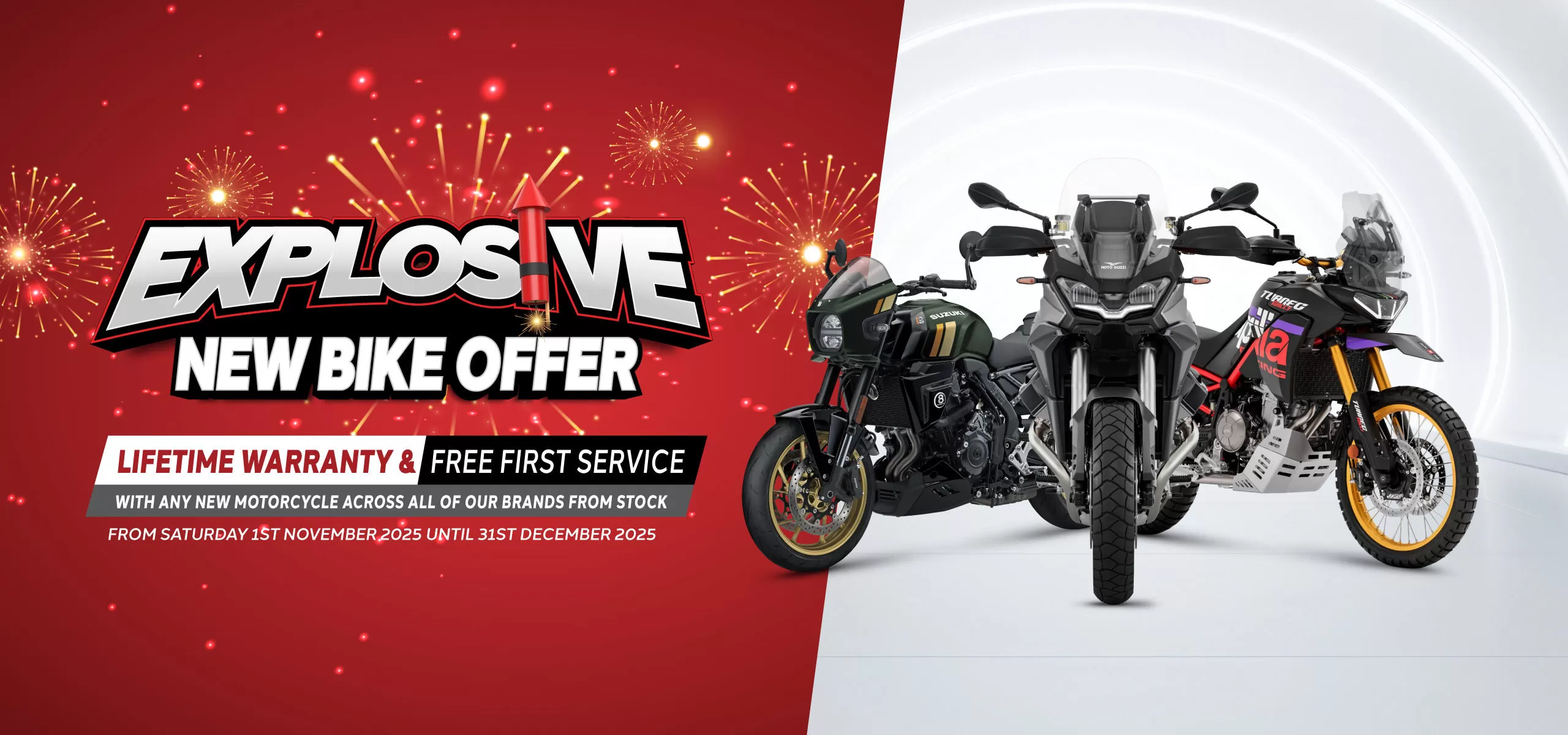 From 1st November to 31st December 2025, every new motorcycle purchase over 401cc comes with a LIFETIME WARRANTY and a FREE FIRST SERVICE - our way of saying thank you for choosing Gloucestershire’s largest and most trusted motorcycle dealership.
