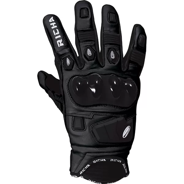 Short racing style glove. Leather construction. Plastic knuckle protectors. Vented finger joints.